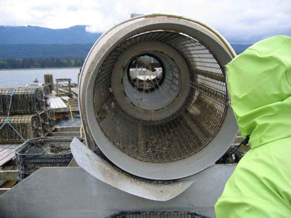 - Tom has a tumbler on the raft and it is set up so that he can manage it all alone: he dumps two trays of oysters in at the top, lets them tumble and roll down to the bottom where he spreads them into trays to put back in the water.