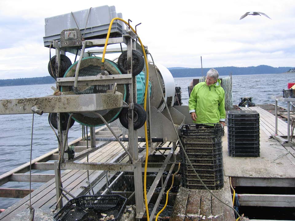 - Tom has a tumbler on the raft and it is set up so that he can manage it all alone: he dumps two trays of oysters in at the top, lets them tumble and roll down to the bottom where he spreads them into trays to put back in the water.